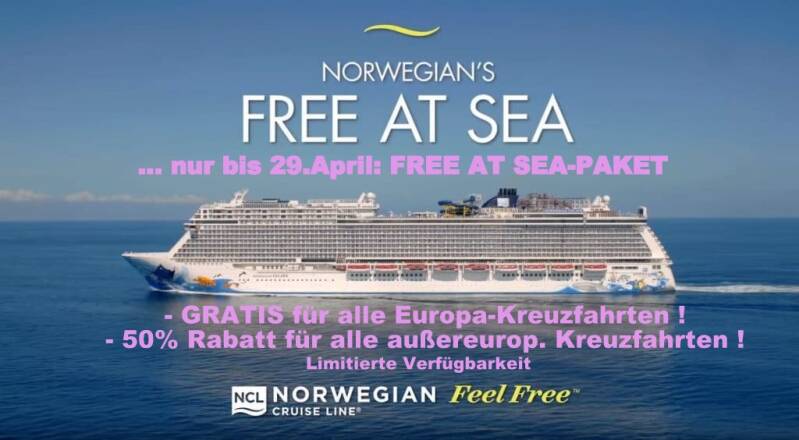 für alle Europa-Kreuzfahrten GRATIS sowie 50 % Ermäßigung auf das Free-at-Sea-Paket für alle Reisen außerhalb Europas